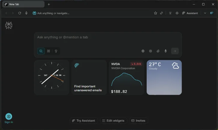 The New Tab is where you find your search assistant/chatbot. It has some widgets, and you can click on Edit Widgets to manage them. The default search experience in the new tab, assistant, and address bar is Perplexity, but you can change the default search engine in the Settings.