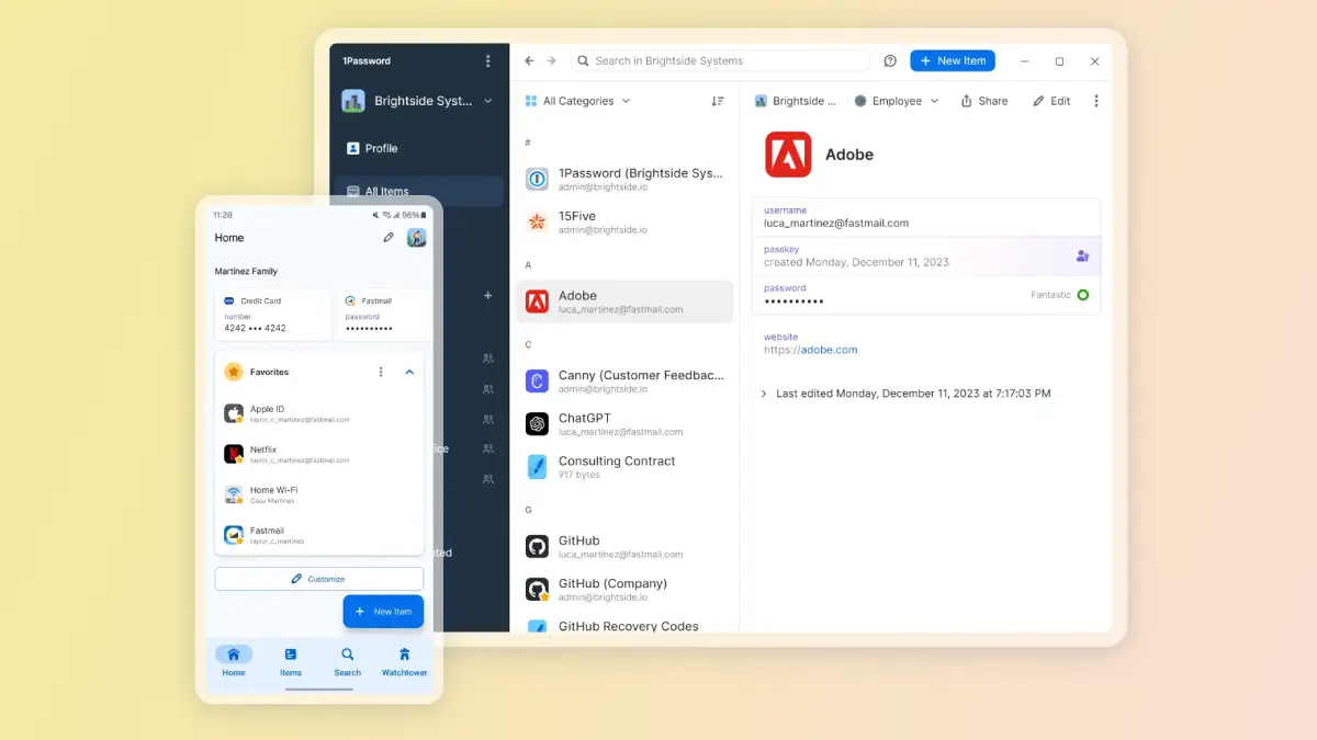 With 1Password Families, you can securely generate passwords, automatically save and fill in your credentials, and share items safely with anyone. The service is accessible across all your devices (computer and smartphone) and provides alerts for weak or compromised passwords.