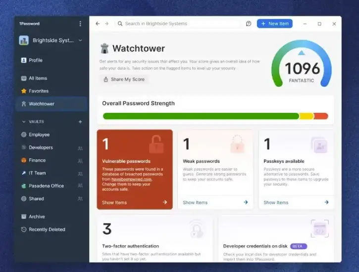 One of its standout features is Watchtower, which assesses your overall password strength, identifies weak or reused logins, and highlights accounts eligible for two-factor authentication and passkeys.