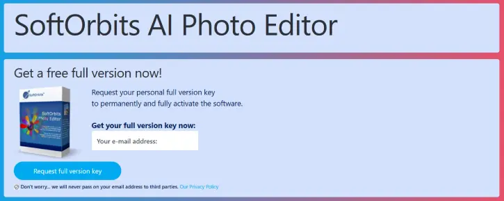 1. Go to SoftOrbits AI Photo Editor Pro official giveaway page, enter your email and click Request full version key button.