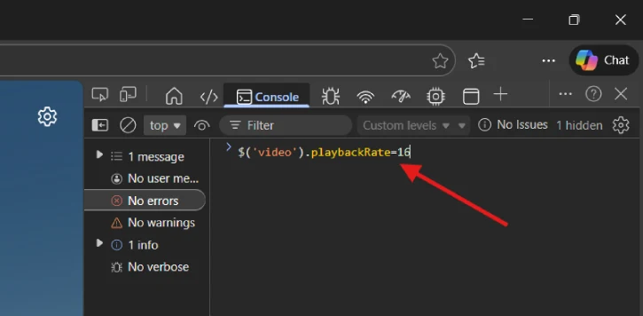 3. In the Console tab, type the following command and press Enter: $('video').playbackRate = x